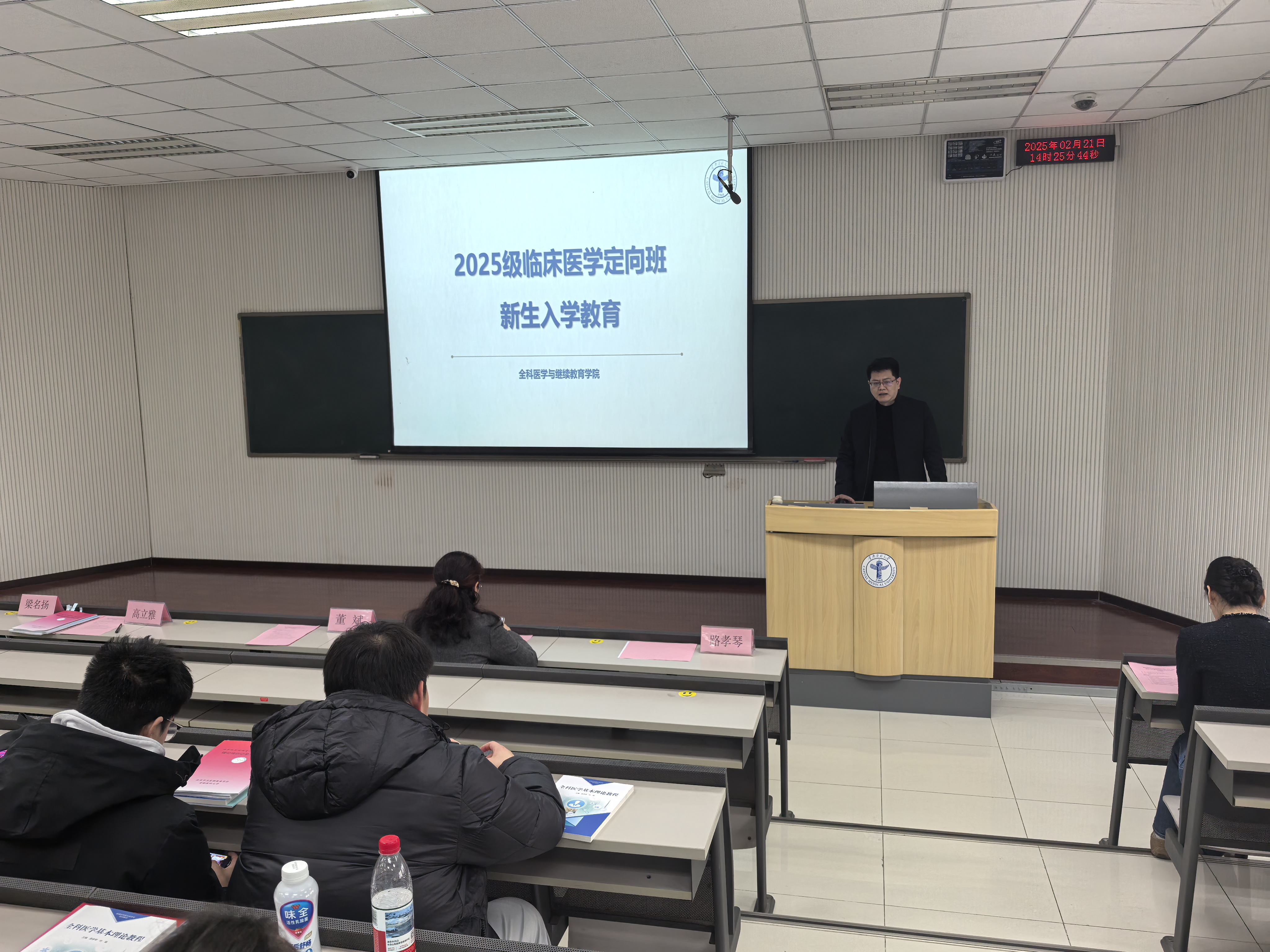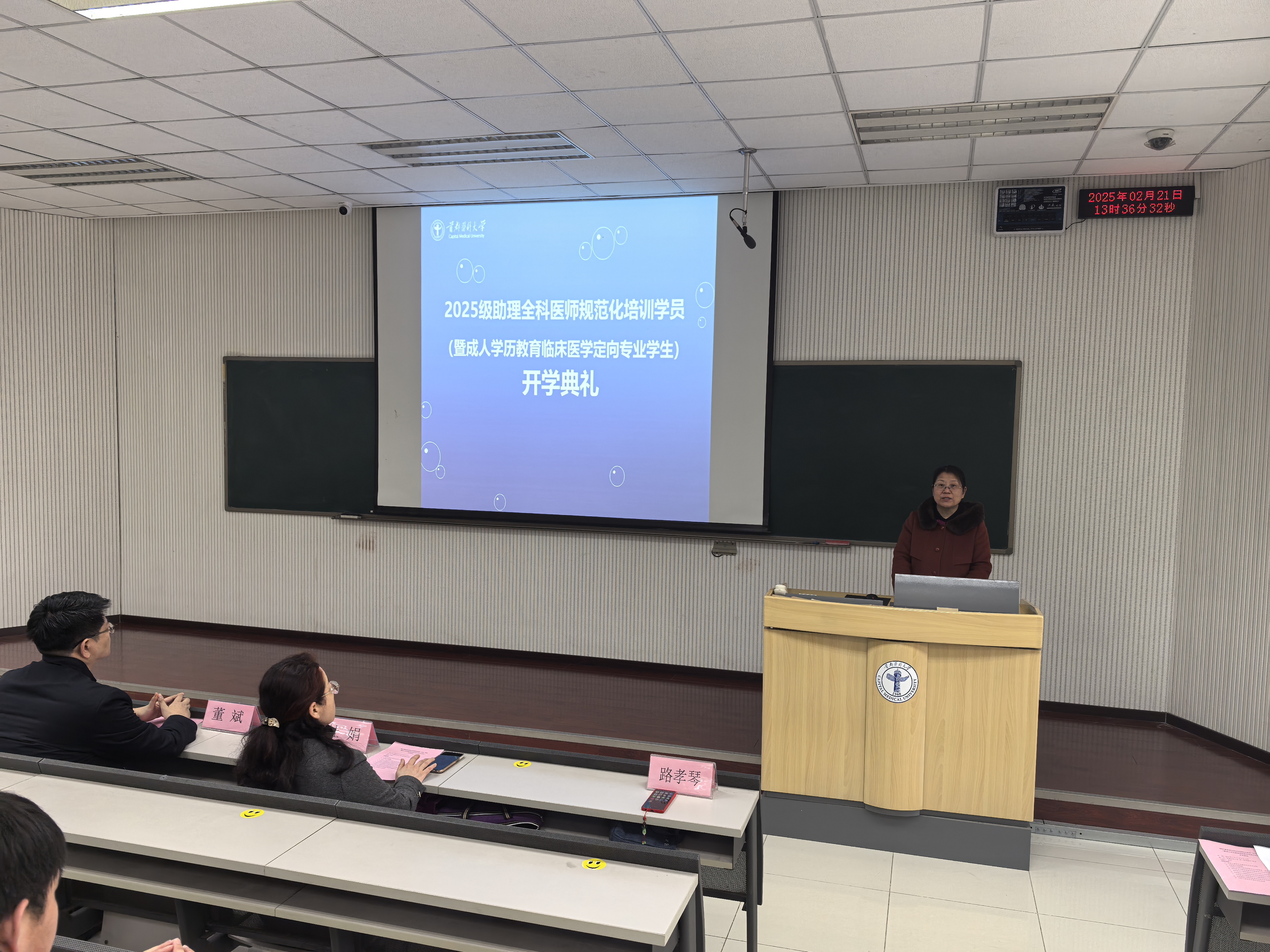 2025级助理全科医师规范化培训学员(暨成人学历教育临床医学定向专业学生)开班/开学典礼在第二教学楼81教室举行。来自密云、大兴、平谷、通州、房山、延庆、昌平、顺义、门头沟、怀柔等10个区的社区卫生服务中心/乡镇卫生院的110名2025级助理全科医师规范化培训学员参加了典礼。
