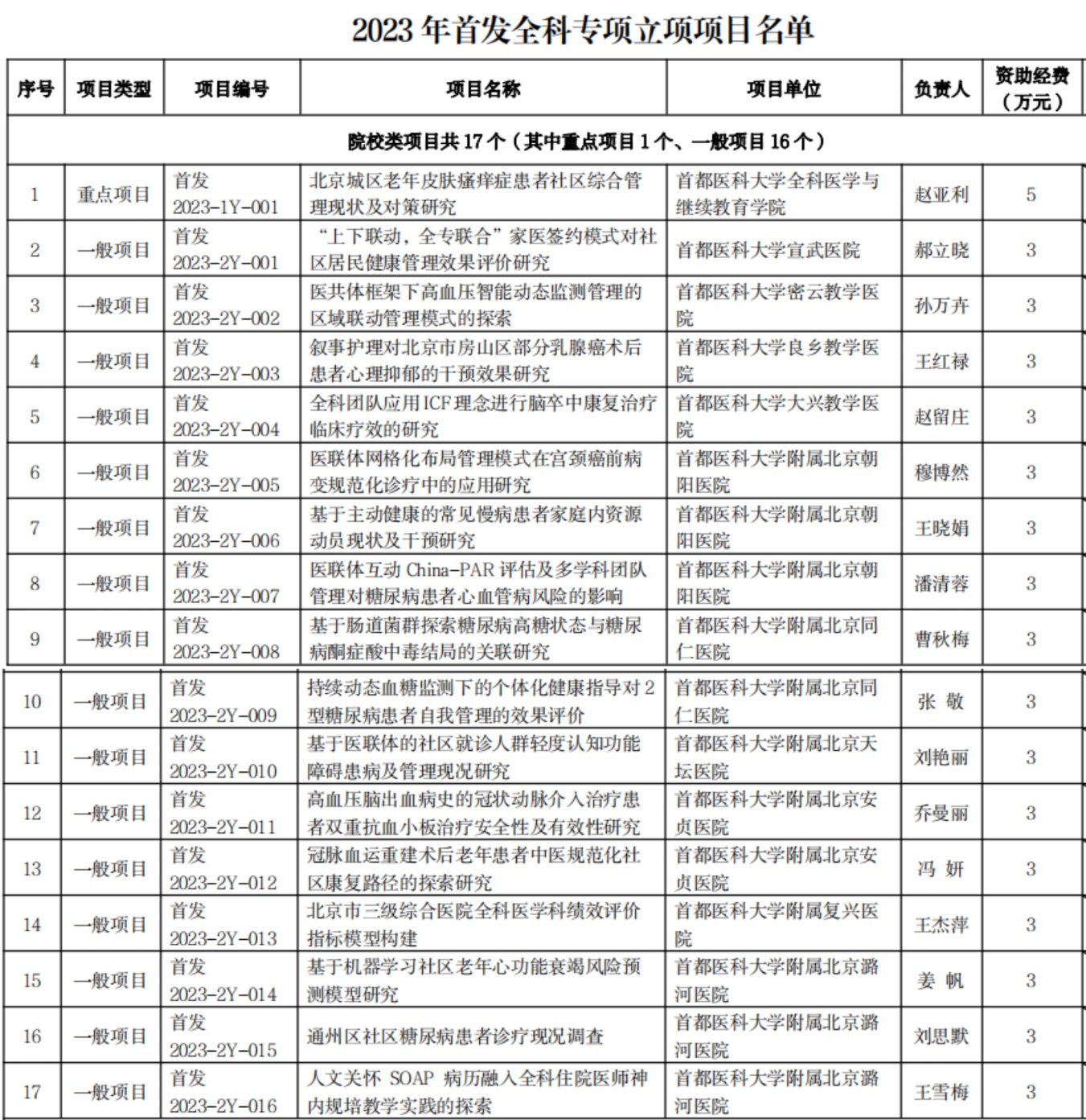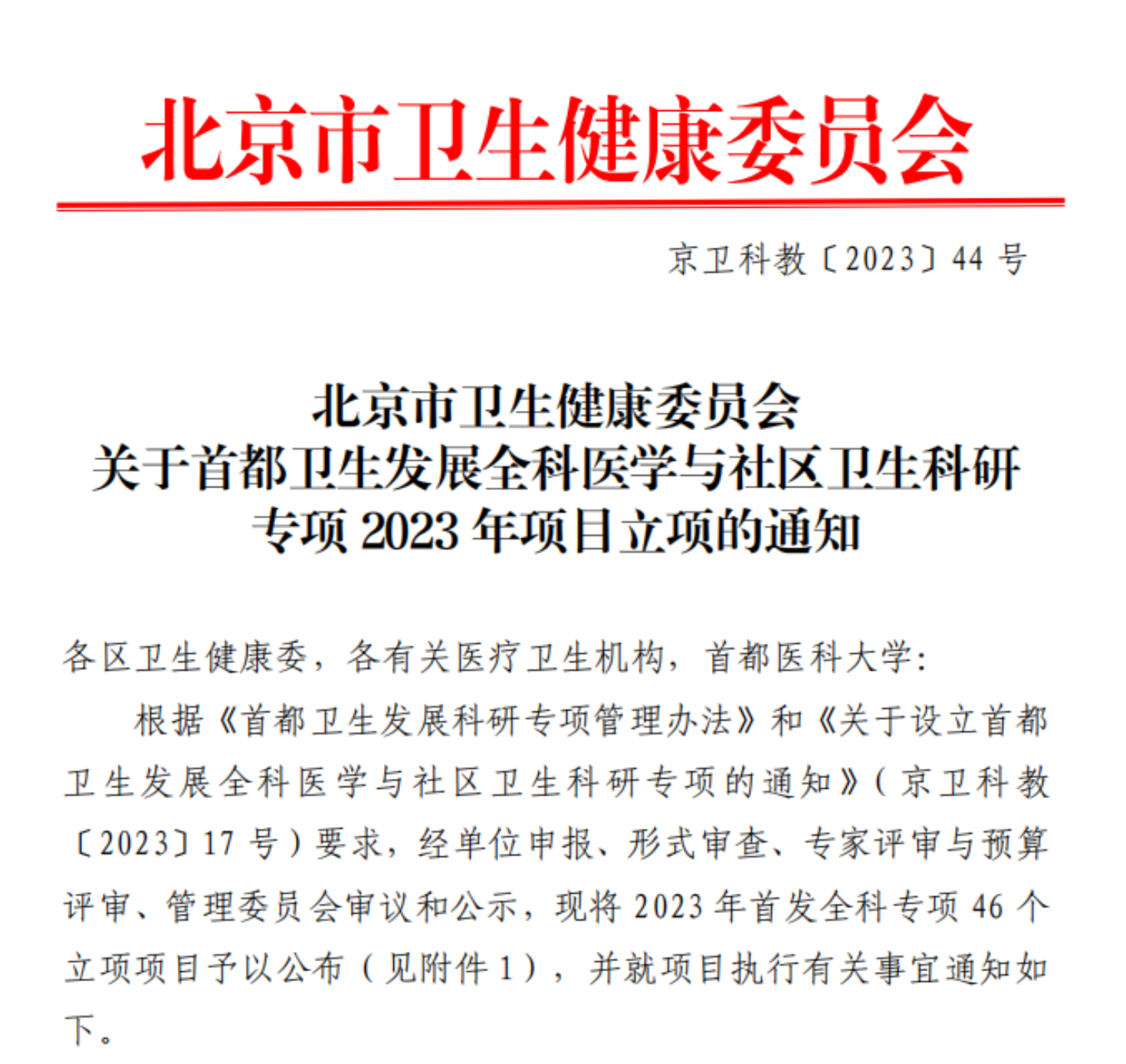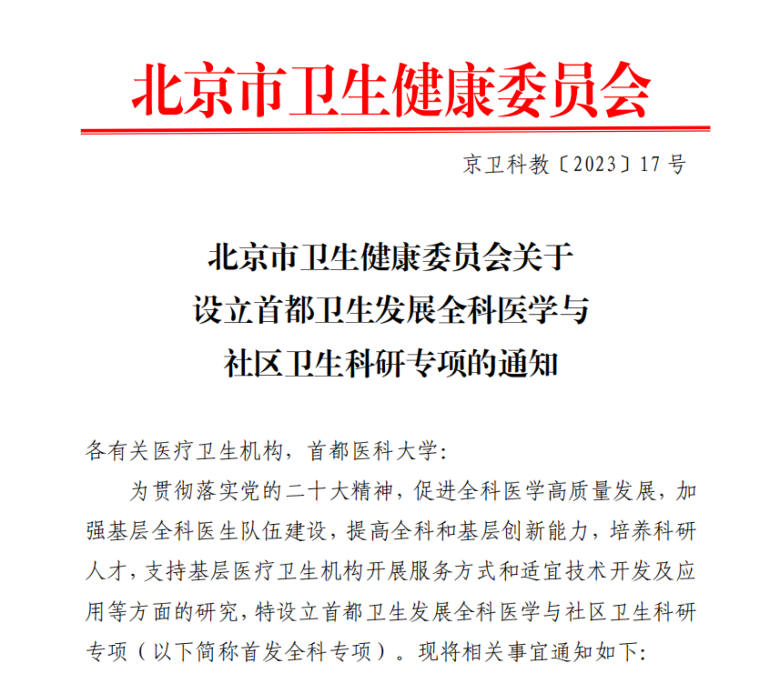 与社区卫生科研专项(以下简称首发全科专项)。在学校领导和相关部门以及市卫生健康委的支持下,2023年6月北京市卫健委设立首发全科专项。