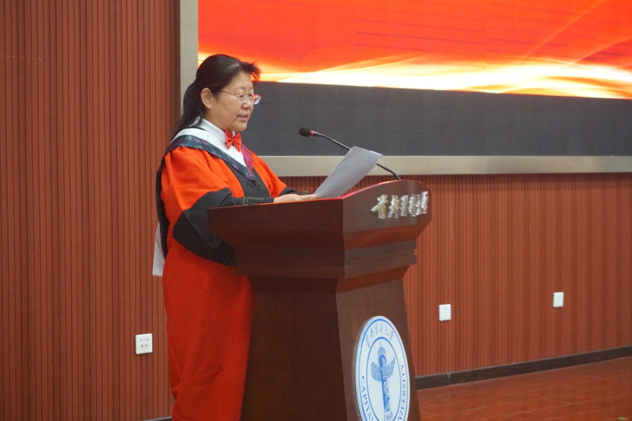 来自平谷教学医院的崔锦娜老师代表教师发言,为同学们送上了老师的期望和祝福。她希望同学们走出校园后保持奋斗的信念,珍惜工作、爱岗敬业。希望同学们时刻不要忘记学习。同时,能够练就强大的内心,勇于面对苦难,迎接挑战。