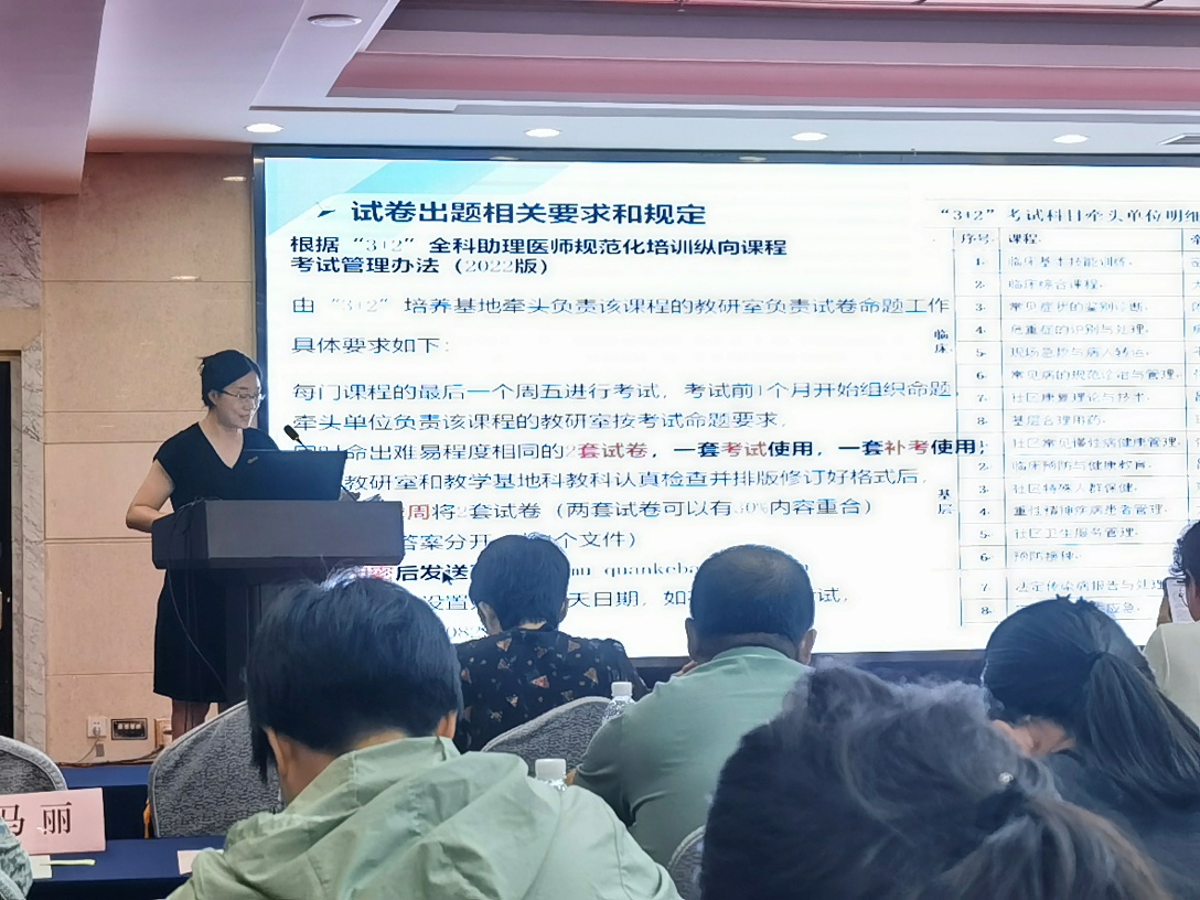 的梁名扬老师进行了助理全科医师规范化培训教学工作要求及新修订管理规定文件解读。通过介绍学员轮转手册的规范填写,试卷出题相关要求和规定,集体备课的要求以及对新修订文件的解读,进一步督促进各基地带教老师规范执行轮转考核标准,加强试题库建设与集体备课质量把控,提升3+2规范化培训的教学规范性与教学质量,切实将培训成效转化为今后提升基层医疗卫生服务能力的强劲动力。